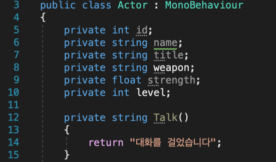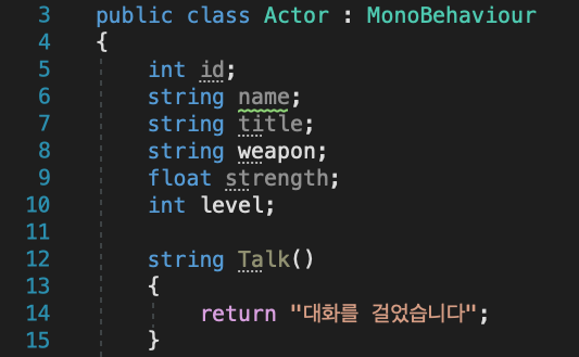 Actor 클래스를 만들어보았습니다. 여기서 Actor는 용사일 수도, 몬스터인 슬라임, 악마, 사막뱀일 수도 있습니다.