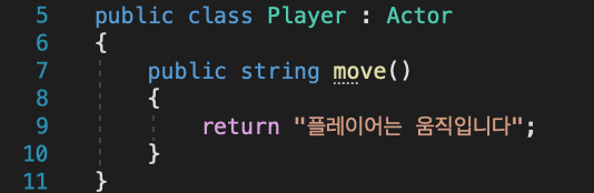 여기서 부모클래스는 Actor 클래스, 자식클래스는 Player 클래스 입니다. 상속 관계를 이루고 있습니다.