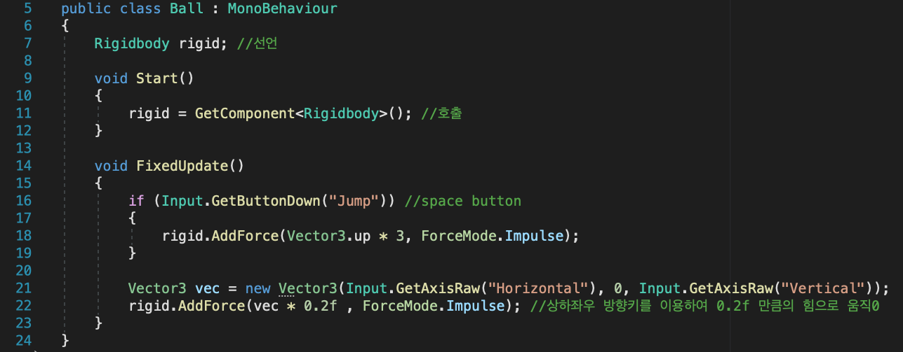 🔻 Rigidbody component를 Ball 에 추가한 후, Rigidbody를 변수로 가져오기 위해서 스크립트를 새로 만들어 추가합니다