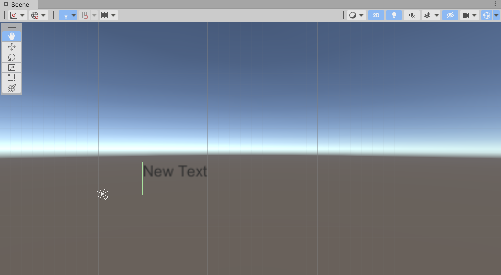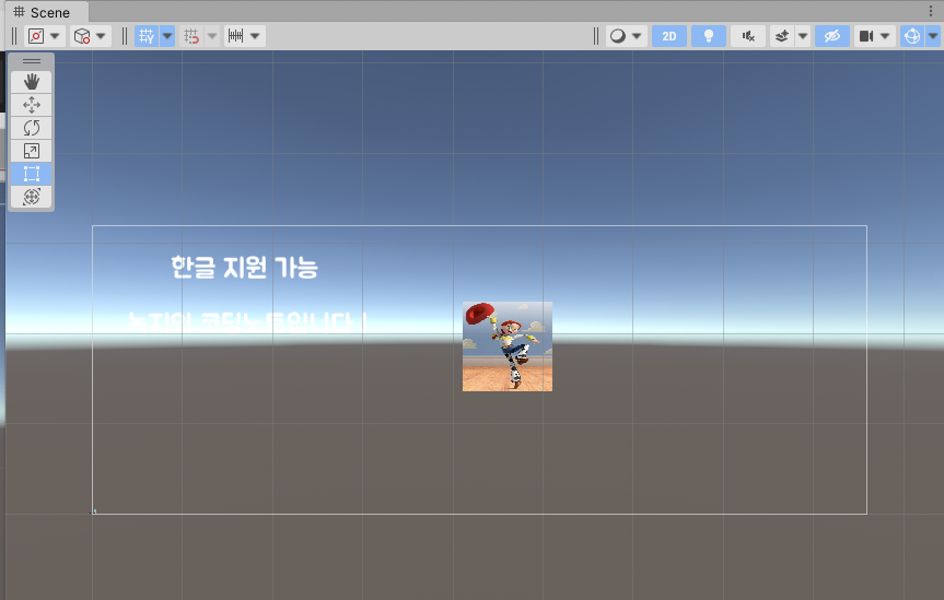 🔻 Canvas를 추가하면 흰 색 캔버스가 씬 창에 나타납니다. 2D를 활성화시켜 화면을 정면에서 바라볼 수 있습니다