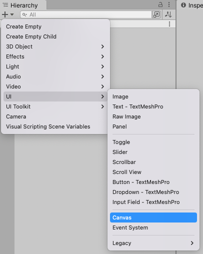 🔻 Hierarchy - UI 컴포넌트를 추가할 수 있습니다