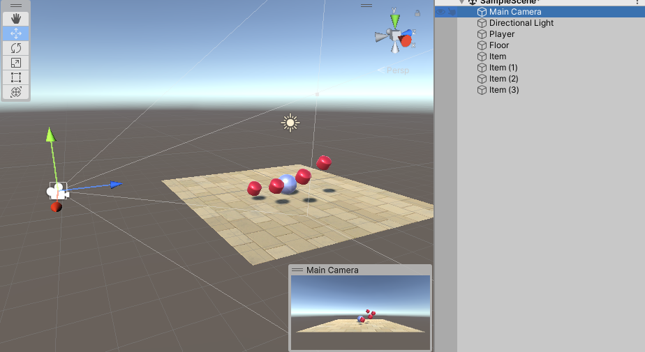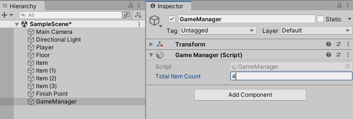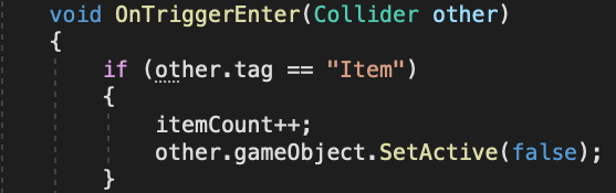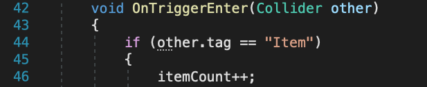✏️ Player 로직에서 'Item' 태그를 가진 오브젝트를 만나면, itemCount 개수 증가 & 사라지는 로직