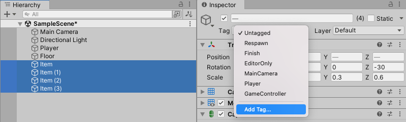 오브젝트에 각각 Tag를 설정하여 묶을 수 있습니다