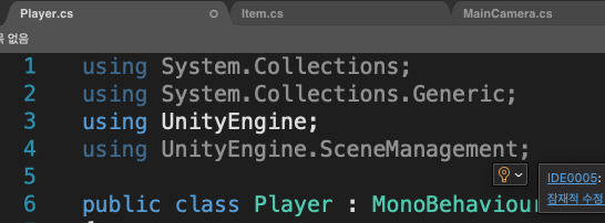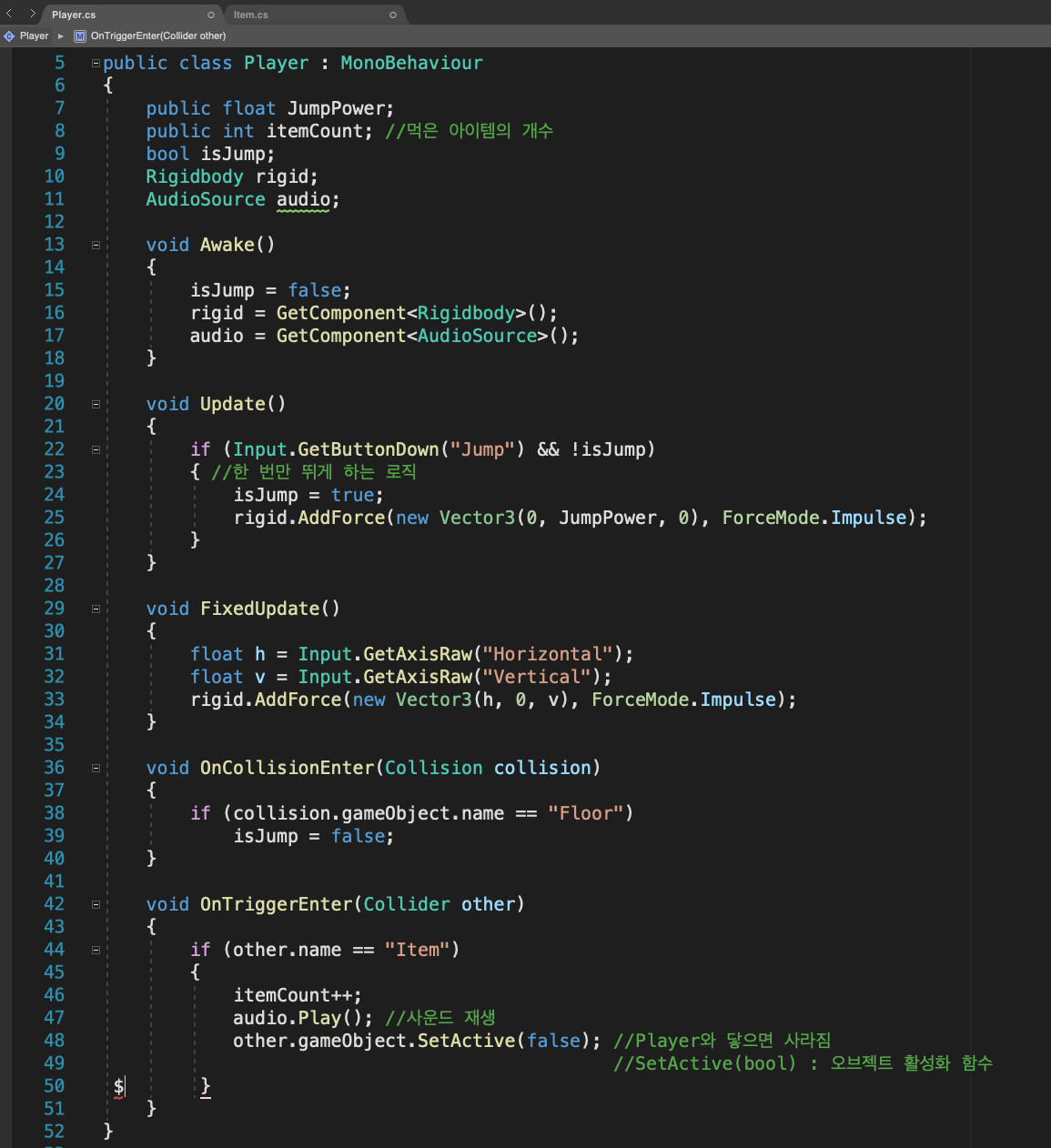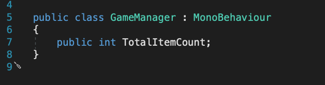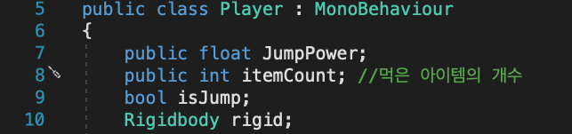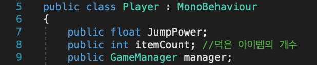 🔻 닿은 아이템 개수를 세기위해 Player 로직에 public으로 itemCount 설정