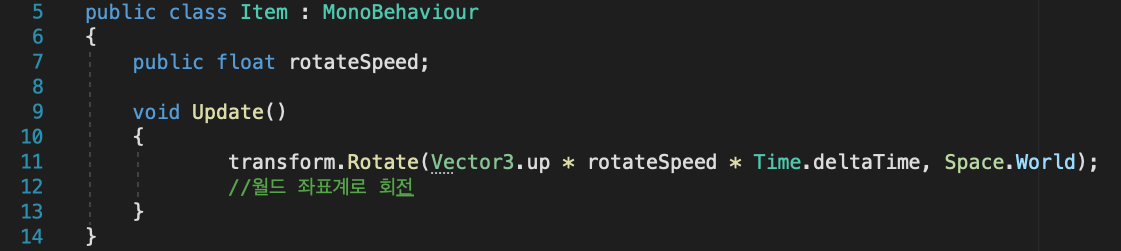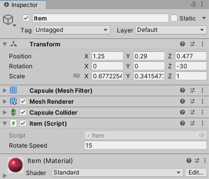 - Item의 Inspector창에서 RotateSpeed값 조정