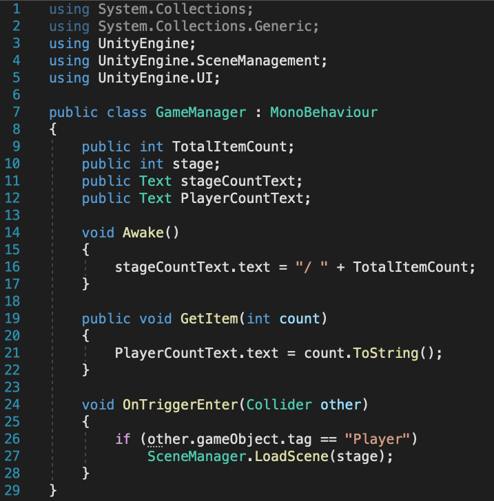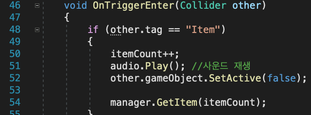 🔻 GetItem 으로 먹은 아이템 개수를 manager로 보내 PlayerCountText를 증가시킵니다