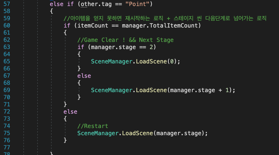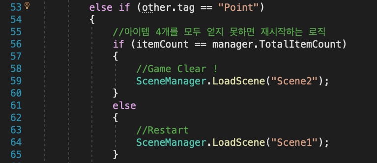 - 먹은 아이템 개수 = 총 아이템 개수 같으면 다음 씬으로, 그렇지 않으면 현재 씬을 다시 불러옵니다