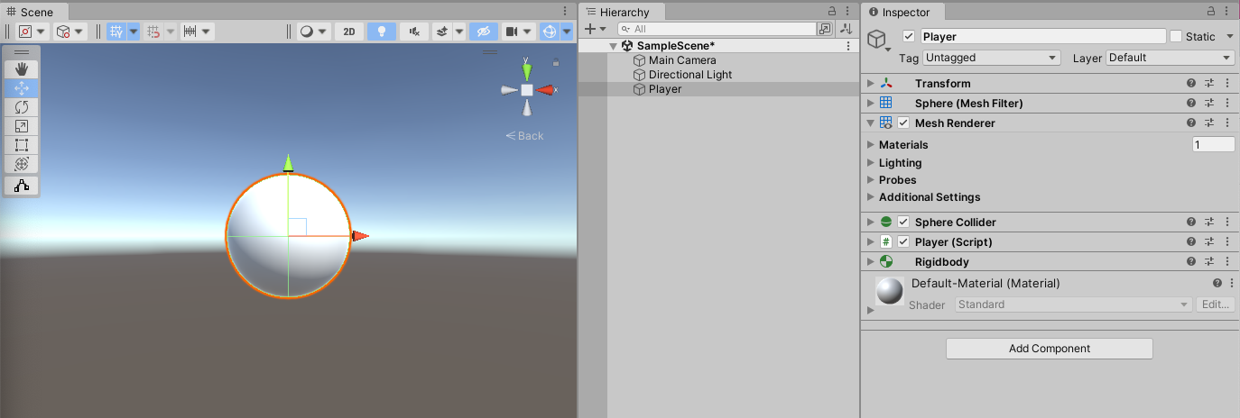 구를 생성하여 Player로 지정해주고, 할당 스크립트와 Rigidbody 컴포넌트를 추가합니다
