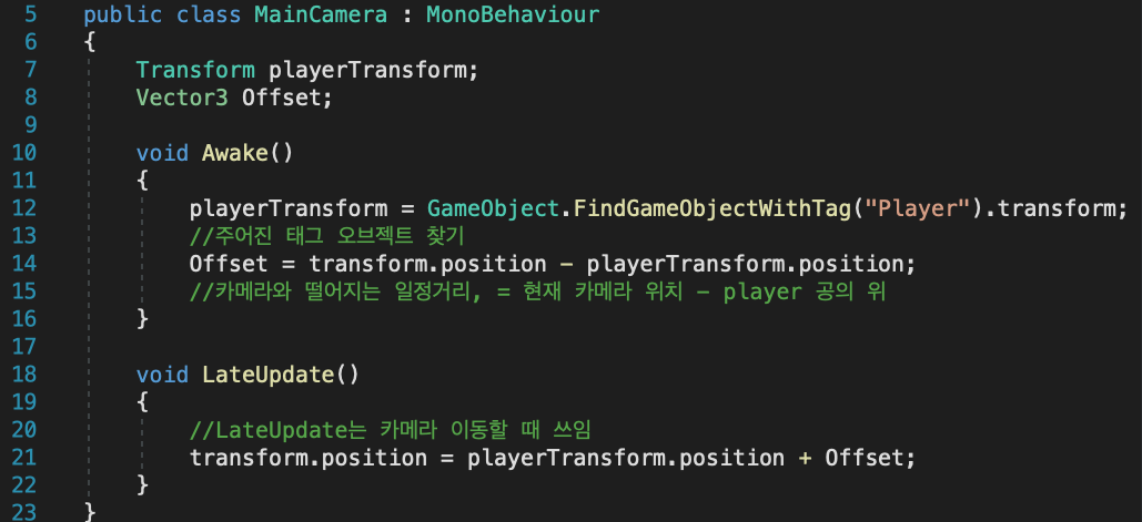 카메라와 떨어지는 일정거리 = 현재 카메라 위치 - Player 공 위치