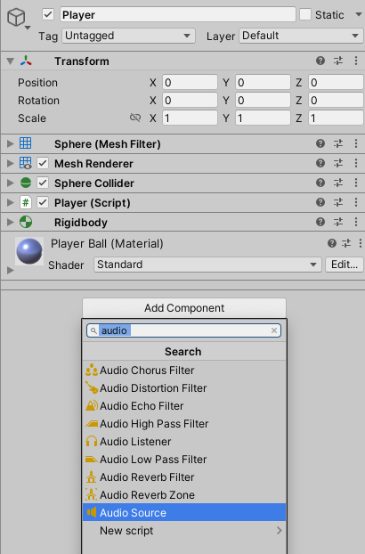 - Player 로직에 AudioSource 컴포넌트를 선언