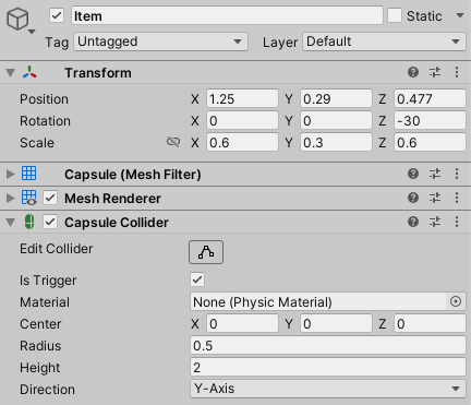- Collider 컴포넌트 생성, isTrigger 활성화 체크