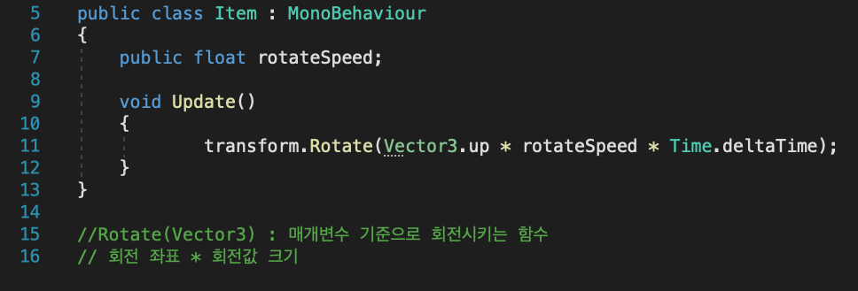 📌 Rotate (Vector3 회전 좌표 * 회전값 크기)