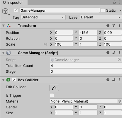 - GameManager은 보이는 실체는 없지만, Collider를 추가하여 투명 박스를 만들 수 있습니다