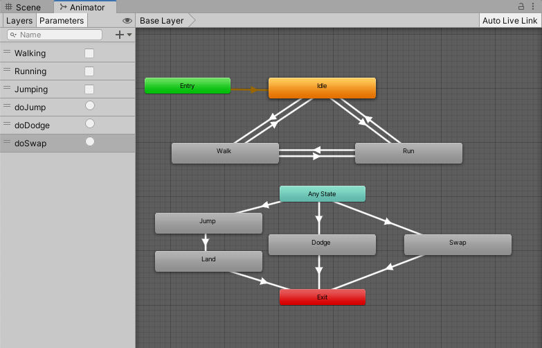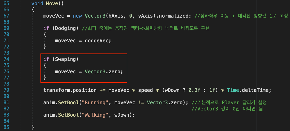 Jump()와 Dodge() 실행 조건에도 Swaping을 하지 않을 때 실행되도록 추가