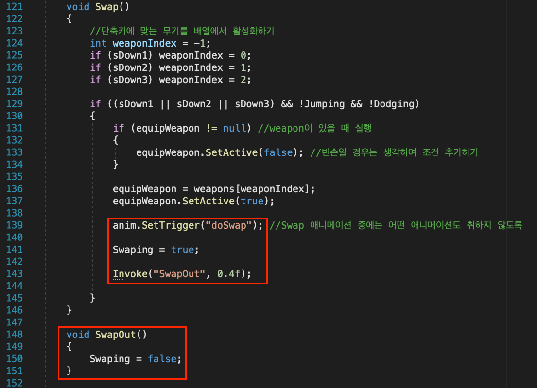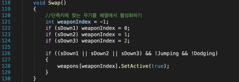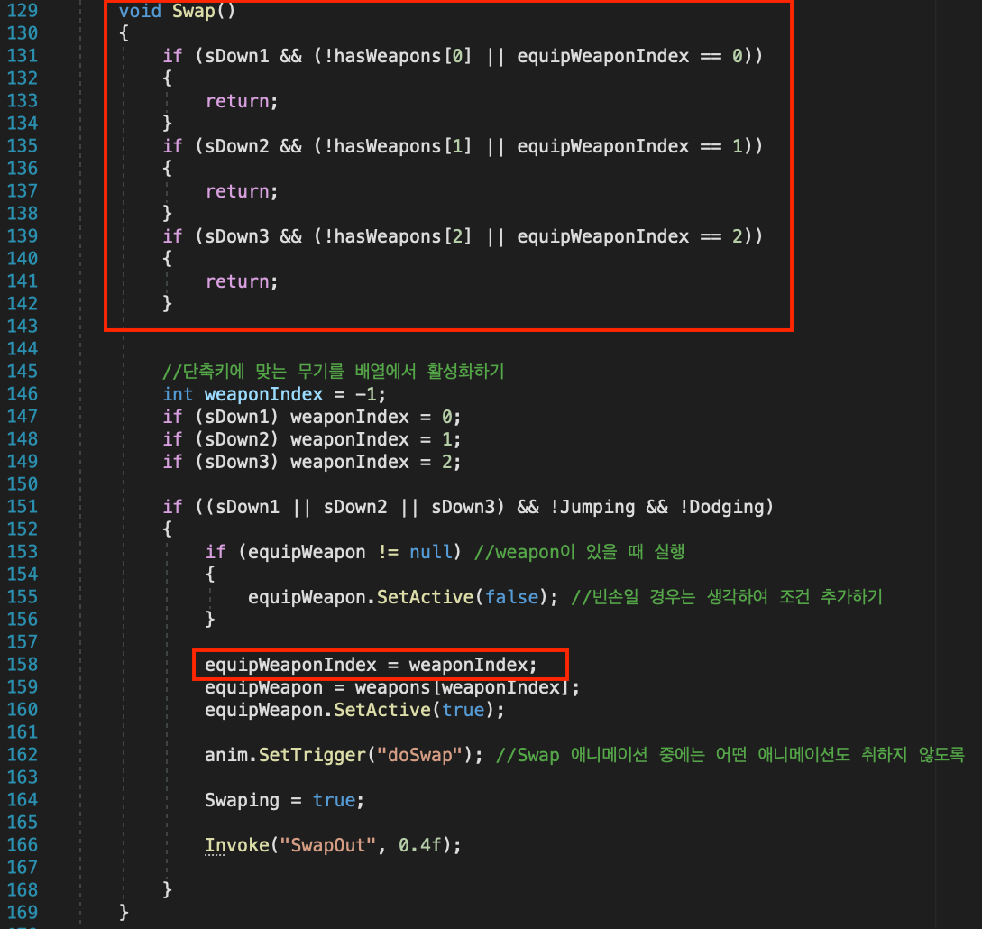 기존에 장착된 무기를 저장하는 변수를 선언하고 활용하기