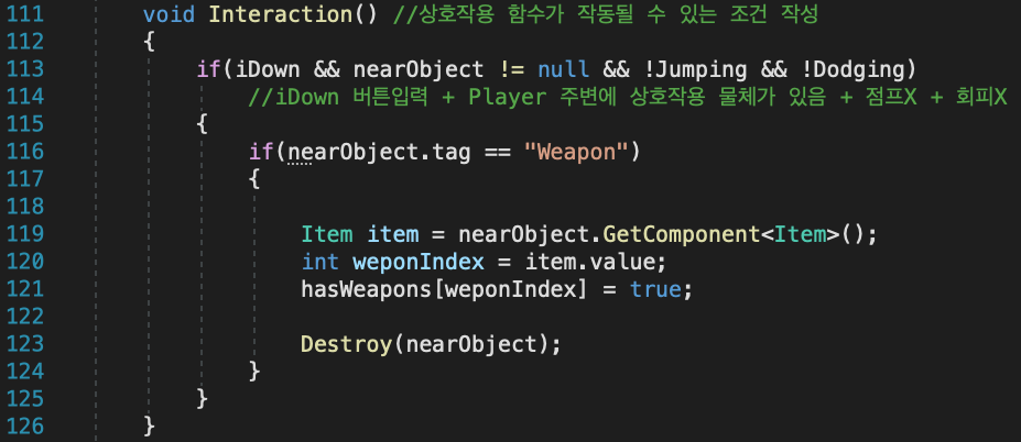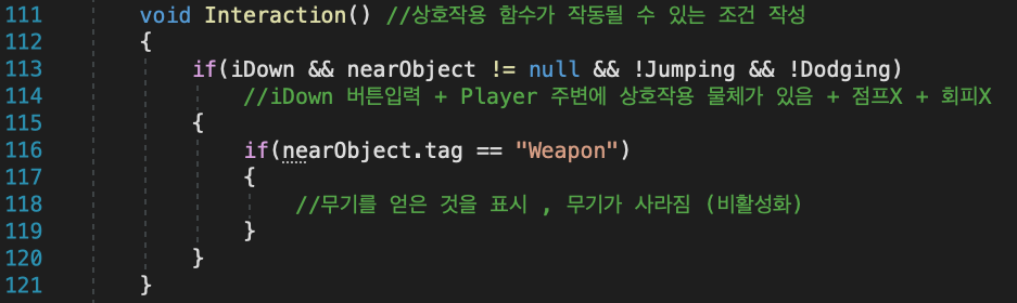 - 조건 : iDown 버튼 입력 + Player 주변에 상호작용 물체가 있음 + 점프X + 회피X