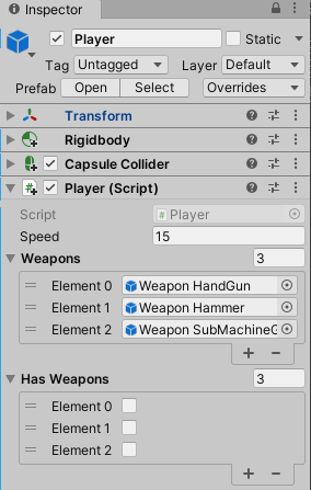 🔻 배치된 3개의 무기 오브젝트는 모두 비활성화 & Player Weapons 배열에 할당