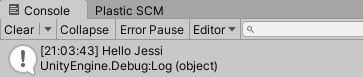 Debug.Log("Hello Jessi"); //콘솔창에 메시지 출력