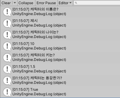 Debug.Log("캐릭터의 이름은?");