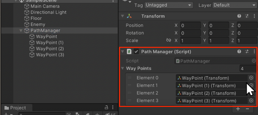 빈 오브젝트 PathManager에 자식 WayPoint를 추가한다.