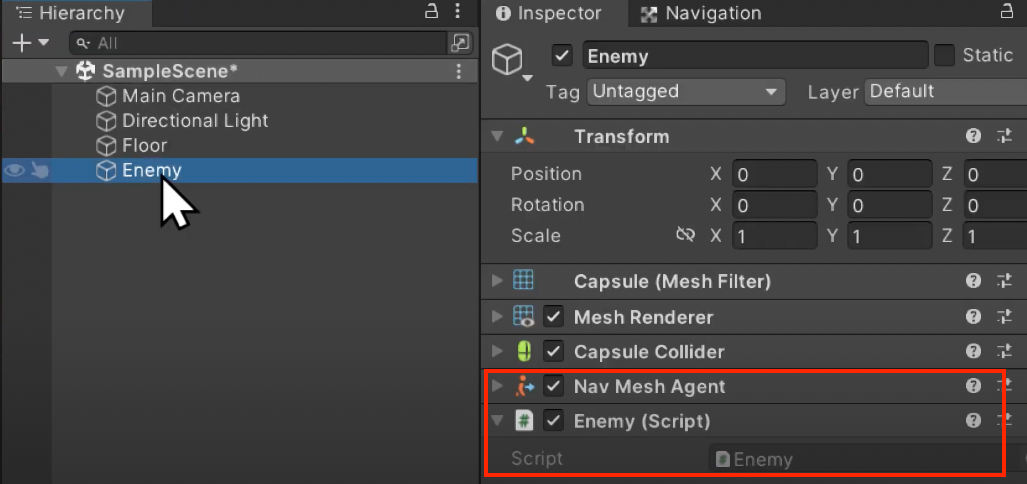 순찰 & 추적할 Enemy를 생성하고 NavMeshAgent와 Enmey.cs를 컴포넌트추가한다