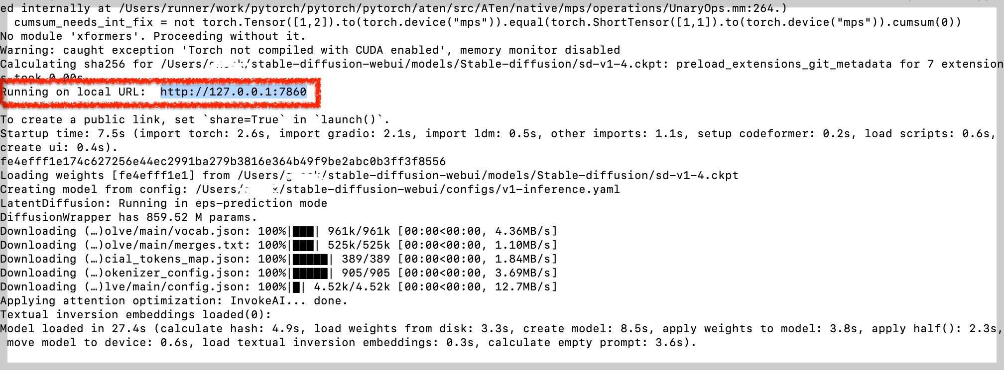 설치가 완료되면 local URL이 나타나고, http://127.0.0.1:7860 해당 경로로 접속이 가능하면 완료입니다.