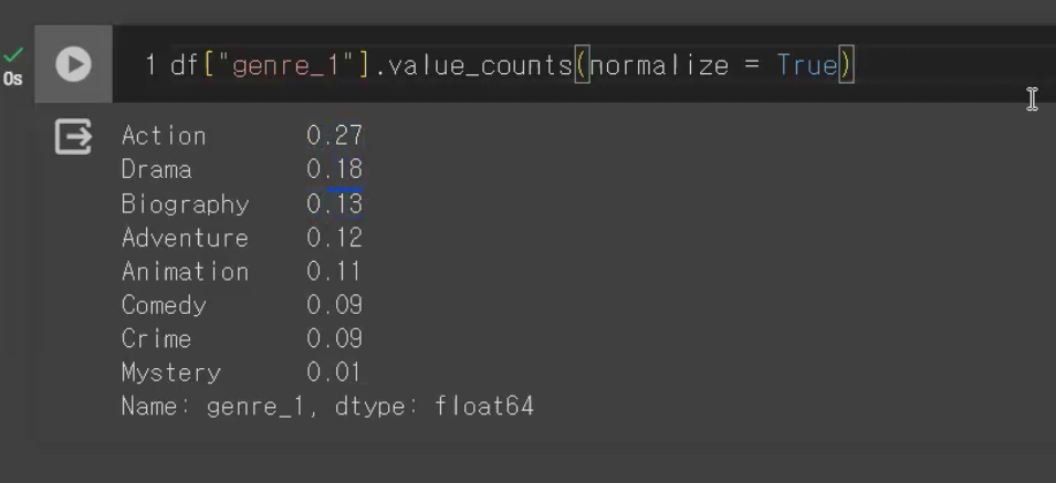 #normalize : 정규화를 True로 설정하면 전체합이 1인 상태에서 모든 값을 비중으로 나누어서 반환을 해준다.
