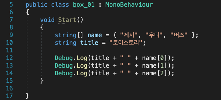 | 유니티 C# 프로그래밍 기초 - 그룹형 변수, 배열로 간단하게 출력하기 (0) | 2022.03.27 |