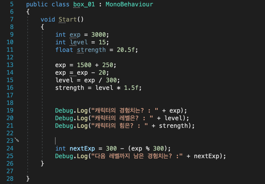 유니티 C# 프로그래밍 [연산자의 종류] & [이항/논리/삼항 연산자 출력하기] [연산자] 연산자는 상수, 변수 값을 연산해주는 기호입니다. 이항연산자 (사칙연산) + 더하기 - 빼기 * 곱하기 / 나누기 몫 % 나머지 int exp = 3000; int level = 15; float strength = 20.5f; exp = 1500 + 250; exp = exp - 20; level = exp / 300; strength = level * 1.5f; 캐릭터의 경험치 exp, 레벨 level, 힘 strength 를 초기화하고 이항연산자로 계산식을 적어보았습니다 변수를 초기화 하더라도 이후에 연산자로 계산하거나 다시 초기화 한 경우에는 가장 나중에 적힌 값이 출력됩니다 호출할 때는 + 부호를 이용해 ..